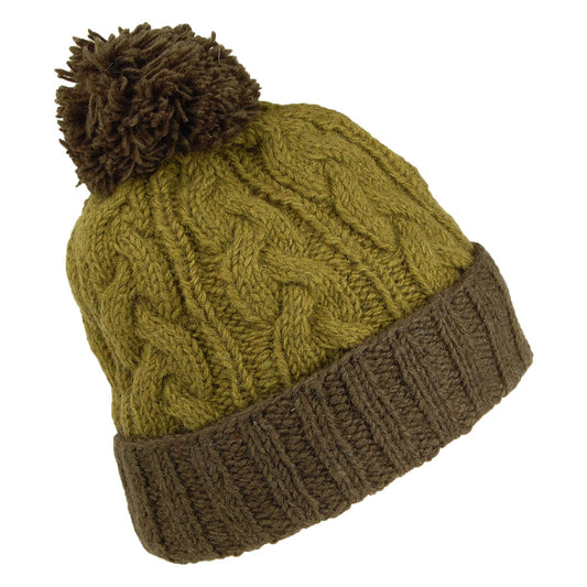 Kusan 2-Tone Cable Knit Turn Up Bobble Hat - Olive-Green