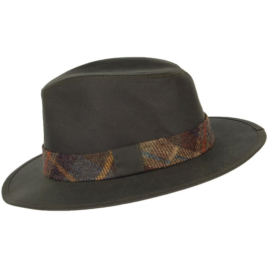 Failsworth Hats Drifter Wax Cotton Tartan Trim Fedora Hat - Olive