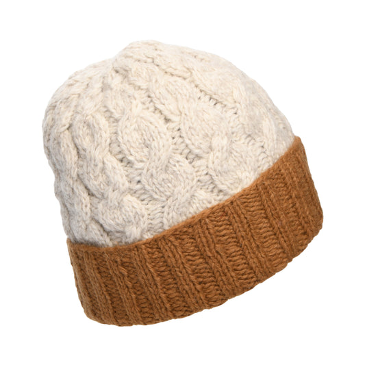 Kusan 2-Tone Cable Knit Turn Up Beanie Hat - Cream-Toffee