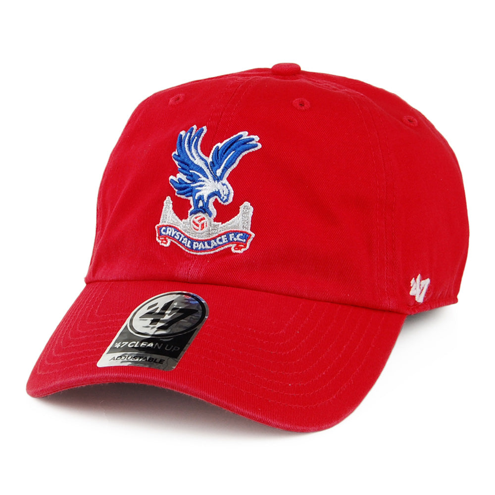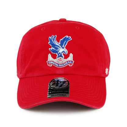 Here is the '47 Brand Crystal Palace F.C. Clean Up Baseball Cap in red. The cap features the team's logo embroidered on the front and the '47 Brand logo embroidered on the side. There is an adjustable strap at the back with a flip tag with the team logo. The hat is made of 100% cotton.