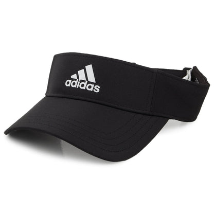Here is the Adidas Golf Tour Visor in black. The front of the visor has a pre-curved brim. On the front is the Adidas logo. There is a strap at the back that adjusts to fit most sizes comfortably.