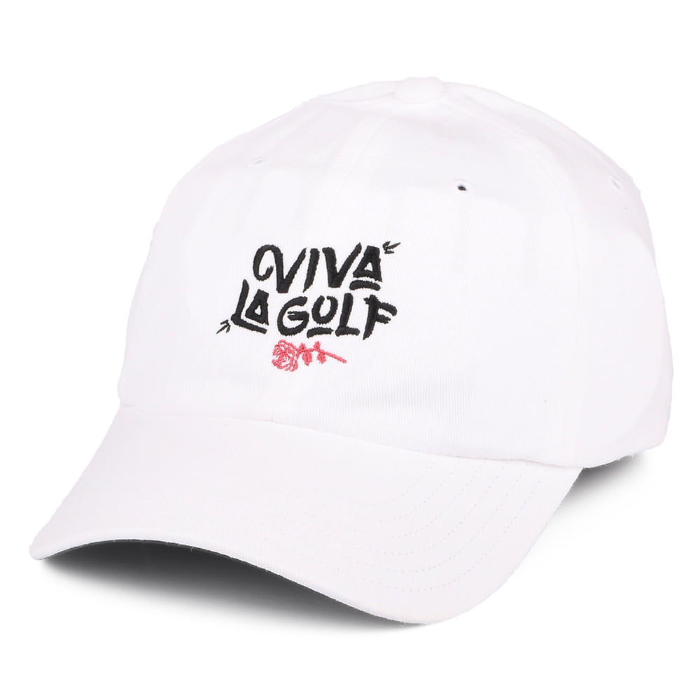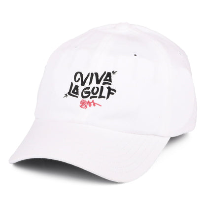 This is the Adidas Women's Novelty Cotton Baseball Cap in white. This cap features a cool Viva la Golf logo embroidered on the front embroidered on the front. The visor is curved and there is an adjustable strap at the back with Adidas featured next to it.