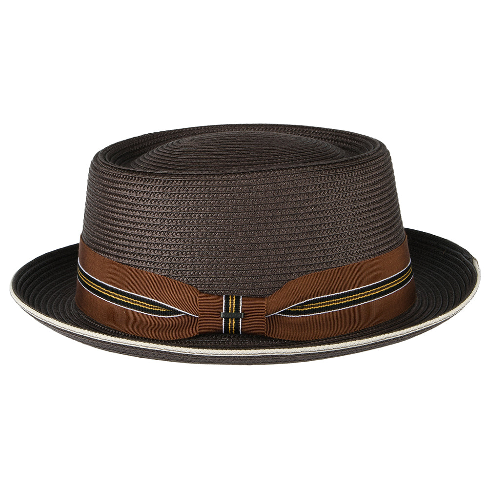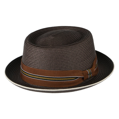 Here is the Bailey Hats Carver Pork Pie Hat in coffee. This beautiful summer pork pie is unlined for breathability and comes with a cotton sweatband for comfort. The hat is decorated with a striped hatband and a Bailey badge on the side.
