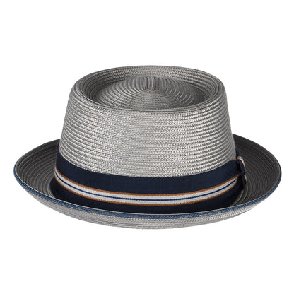 Here is the Bailey Hats Carver Pork Pie Hat in grey. This beautiful summer pork pie is unlined for breathability and comes with a cotton sweatband for comfort. The hat is decorated with a striped hatband and a Bailey badge on the side.