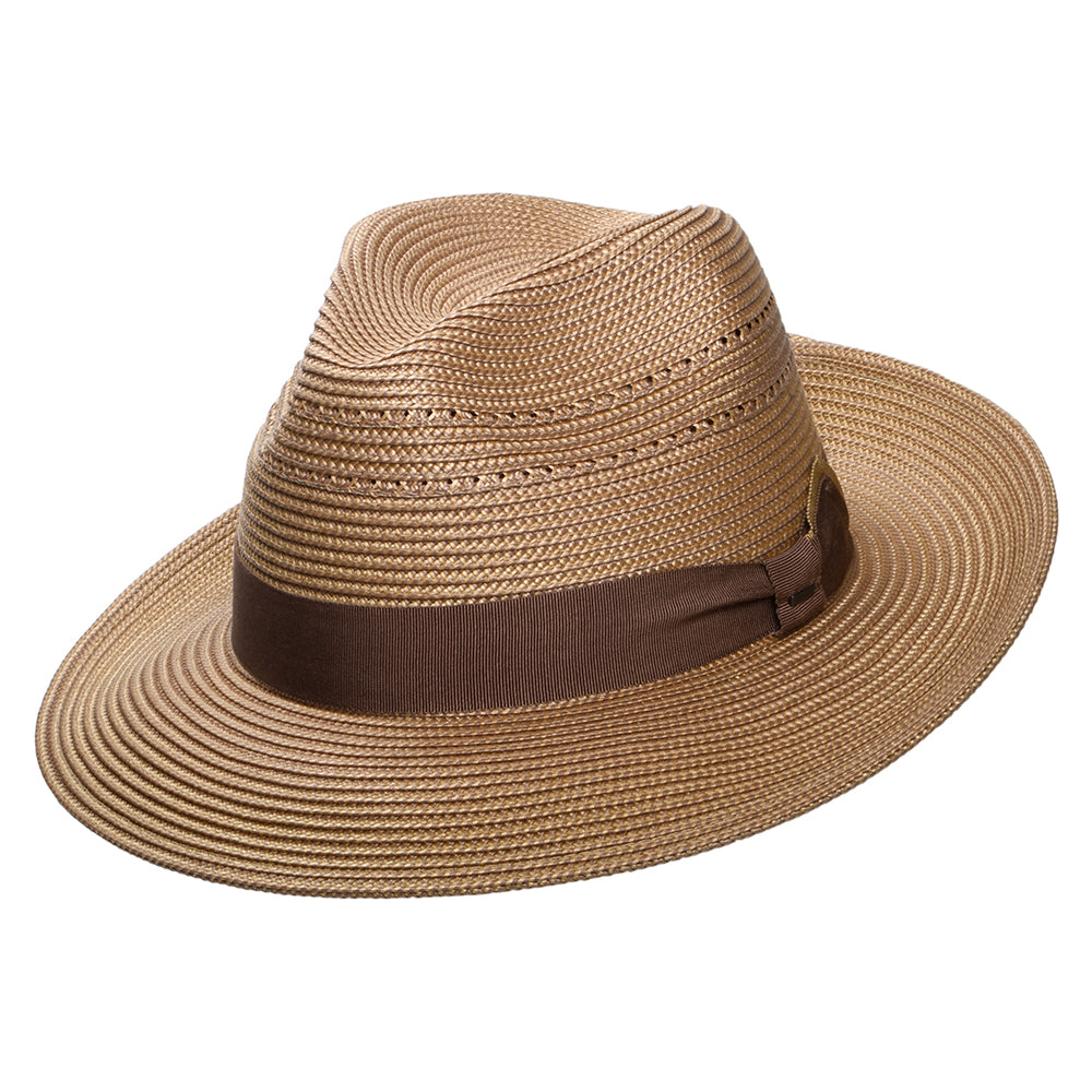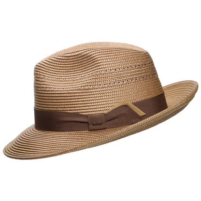The Bailey Eli Fedora Hat in light brown features a unique two-tone braided construction with a grosgrain hatband finished with a contrasting accent and a Bailey badge on the side. Unlined, the hat comes with a cotton sweatband for additional comfort.
