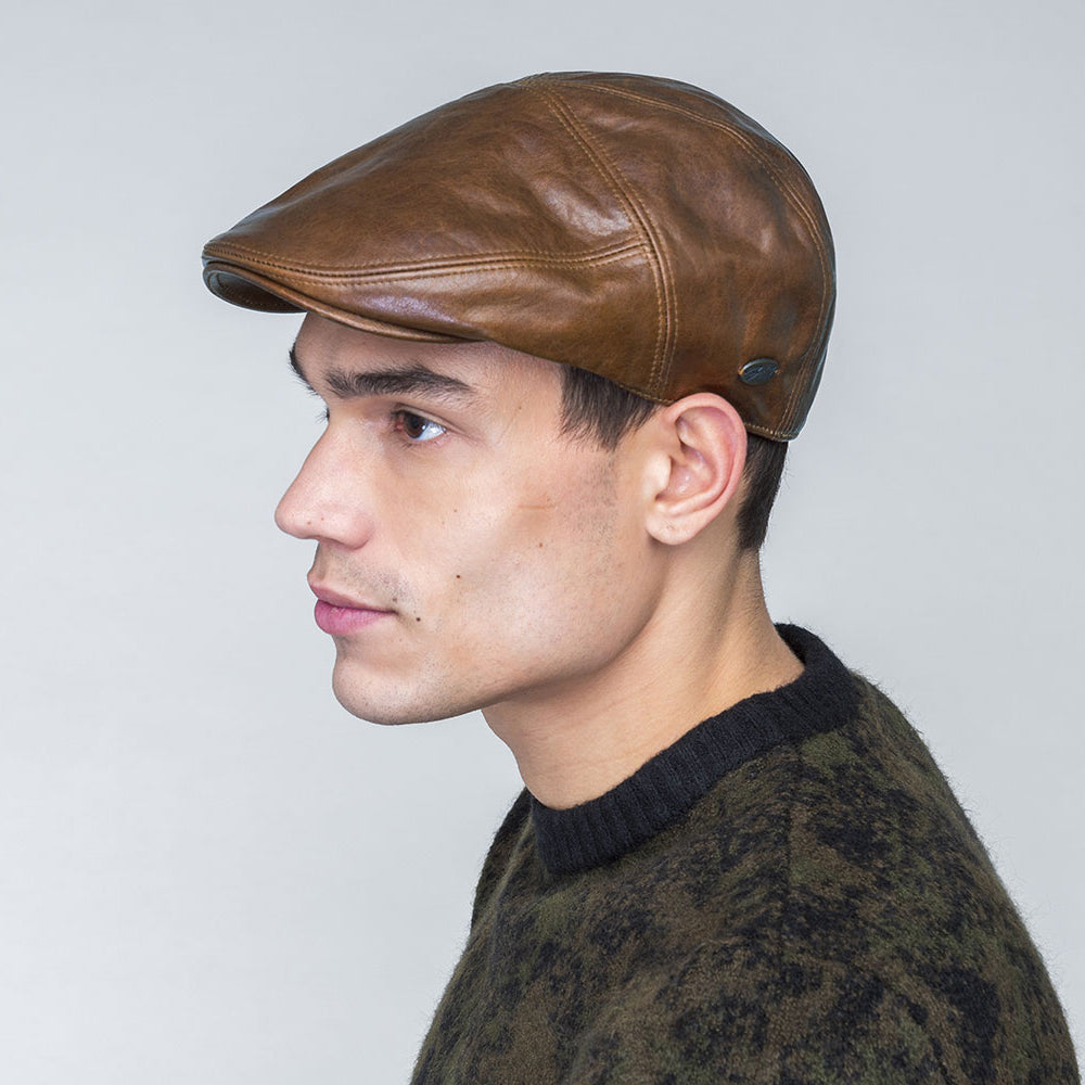 The Bailey Refell flat cap in brown is a handsome leather hat that feels very soft. The cap is composed of seven panels and the front is sewn down to the brim. The inside of the cap features a lining and a soft sweatband which makes it very comfortable to wear. A discreet metal Bailey badge can be found on the side of the cap.