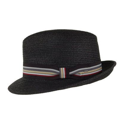 Here is the Bailey Salem Fedora Hat in black. This summer style is made of a unique straw that is 55% toyo straw (paper straw) and 45% polyester. The brim measures approximately 5cm wide and the crown measures approximately 9.5cm tall. The fedora comes with a striped grosgrain hat band with a Bailey pin attached to the side.