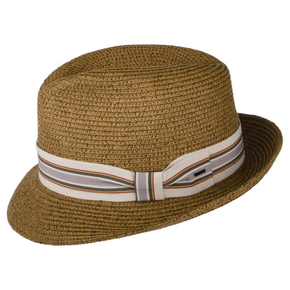 Here is the Bailey Salem Special Fedora Hat in brown. This summer style is made of a unique straw that is 55% toyo straw (paper straw) and 45% polyester. It is unlined for breathability and comes with a cotton sweatband for comfort. The snap brim measures approximately 6cm wide and the crown measures approximately 12cm high. The fedora comes with a striped grosgrain hat band with a Bailey badge attached to the side.