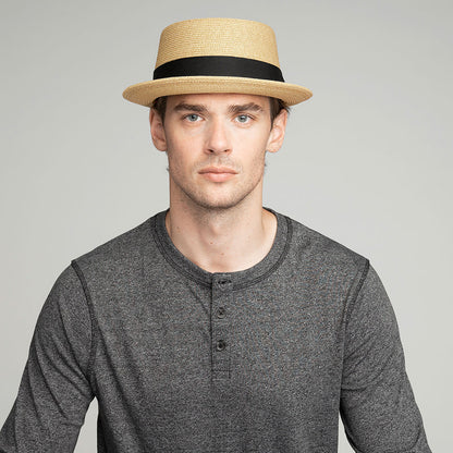 The very stylish Waits Pork Pie from Bailey in sand is the perfect little accessory for the summer. Keeping all the aspects of the pork pie with a very wide hat band with the Bailey logo on the knot on the left hand side. To insure a soft feeling you will find a cushioned sweatband.
