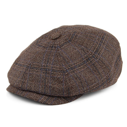 Here is the Bailey Zeff Newsboy Cap in brown-blue. The cap has a lovely and subtle pattern. The crown is sewn to the brim. There is a Bailey hat pin attached to the side. There is a soft lining for a comfortable fit.