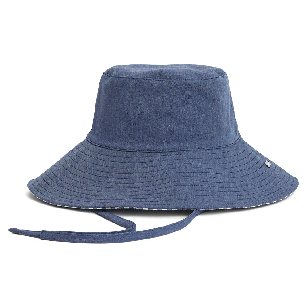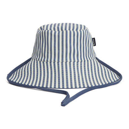 The Barbour Fleur in blue-white is a cute wide brim sun hat. Reversible, the hat can be worn as a blue sun hat with a Barbour badge on the brim, or flip it inside out and you can wear a cute blue and white striped hat with a Barbour flip tag on the side of the crown.