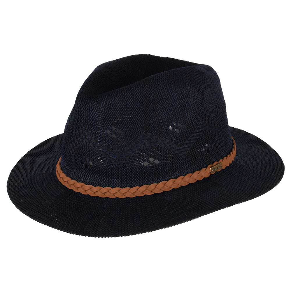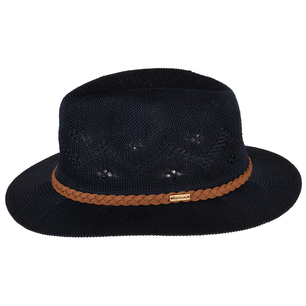 The Barbour Flowerdale Crochet Fedora Hat in navy blue is a great summer hat, featuring a lovely pattern around the crown and a leather hat band with a Barbour pin attached on the side. The hat is unlined and features a sweatband for comfort. A perfect hat for a summer walk or a day at the beach.