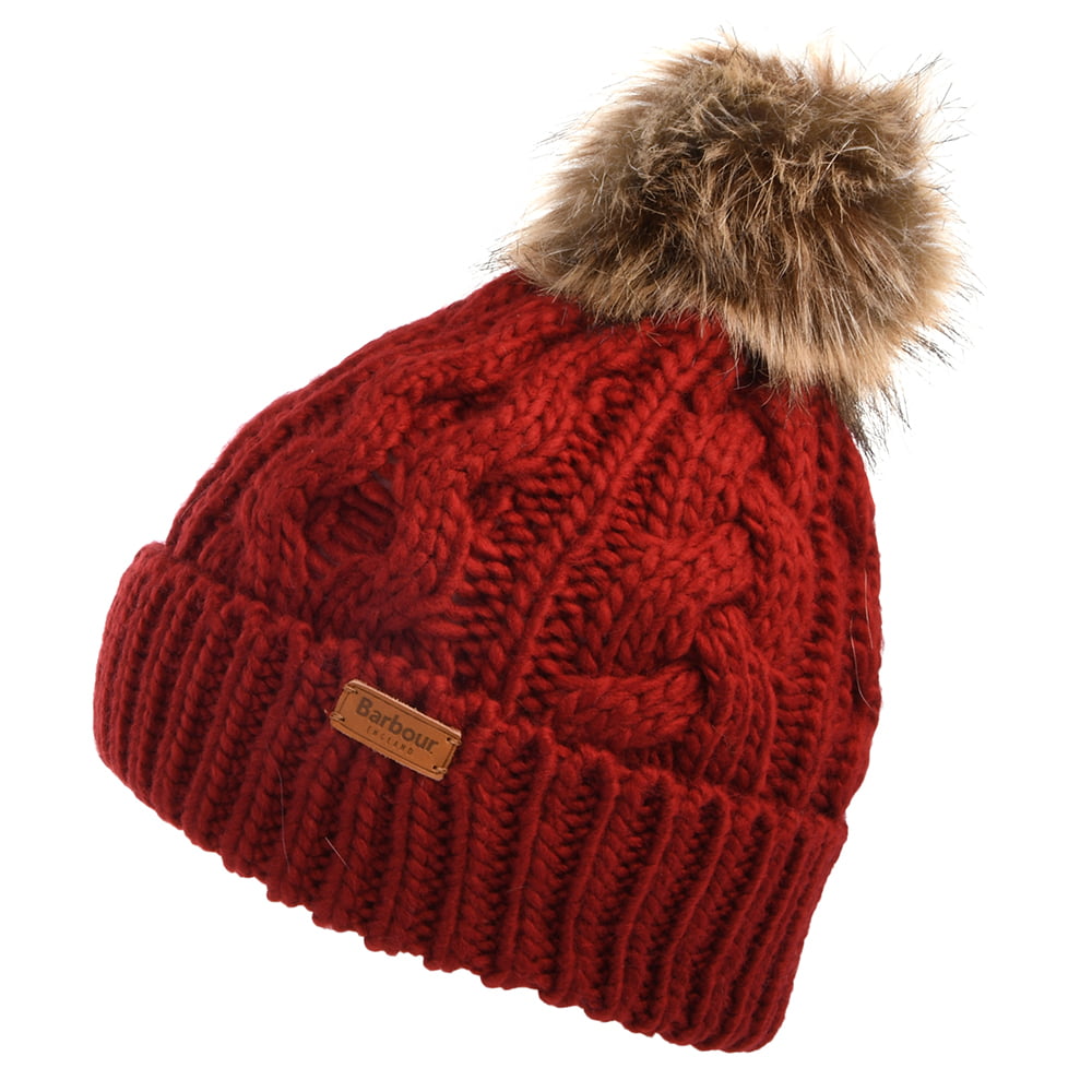 The Penshaw Cable Knit Faux Fur Pom Bobble Hat in crimson from Barbour has a cable knit pattern in the crown and a faux fur bobble on the top. On the ribbed cuff is a small leather Barbour tag sewn on. A great hat for the colder months of the year!