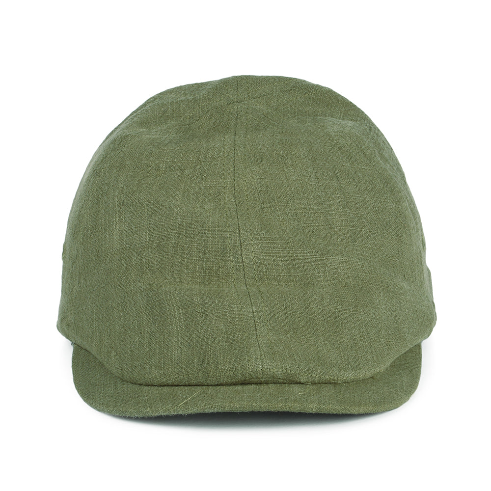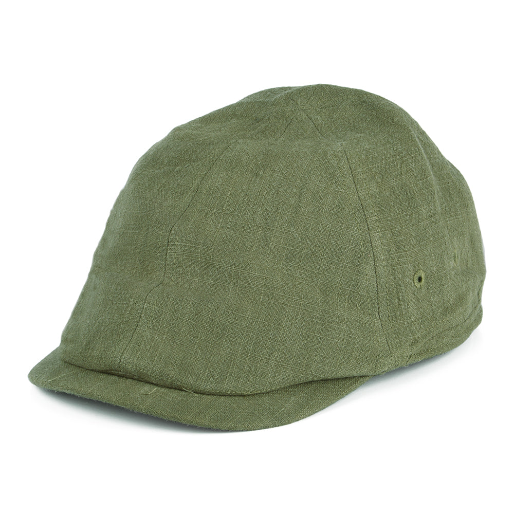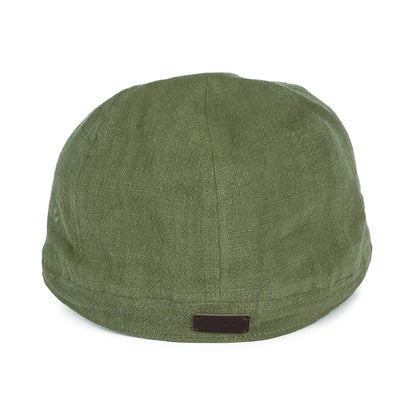 The Barbour Stanhope Duckbill Flat Cap in washed olive is a lightweight made of a linen and cotton blend. It features a leather Barbour tag sewn at the back and eyelets on the sides for breathability. The front of the cap is sewn down to the brim.