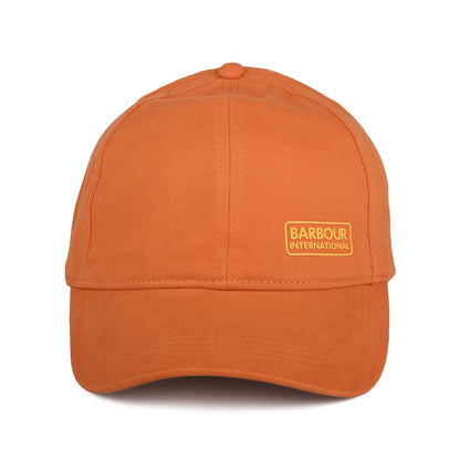 The Barbour International Norton Drill Baseball Cap in orange is a lightweight cap made of 100% cotton and features an adjustable strap at the back for easy sizing. It is finished with a rubber Barbour logo on the left side of the unstructured crown.