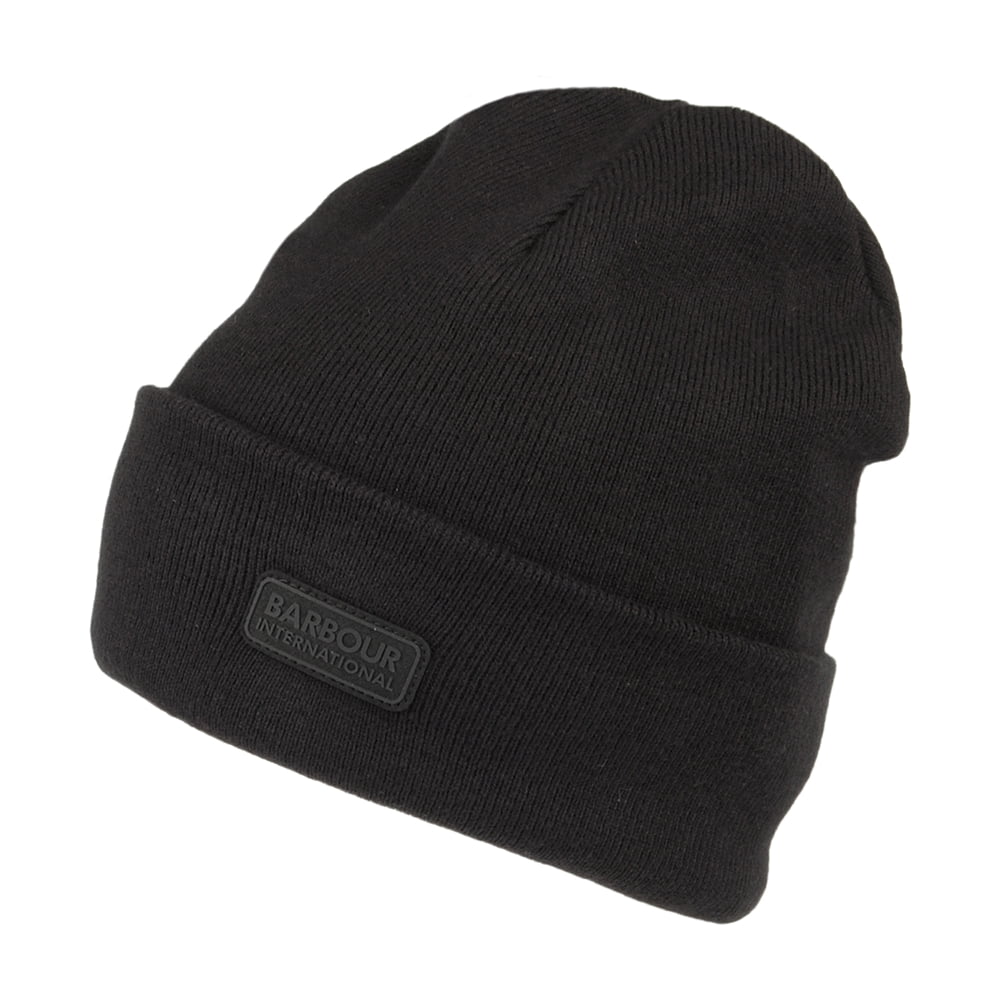 This is the Barbour International Sensor Knit Beanie Hat in black. This classic cuffed beanie style features a Barbour International patch sewn to the front of the hat. The beanie is dual layered for added warmth so it will keep you warm during the cold winter days.