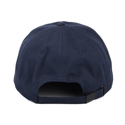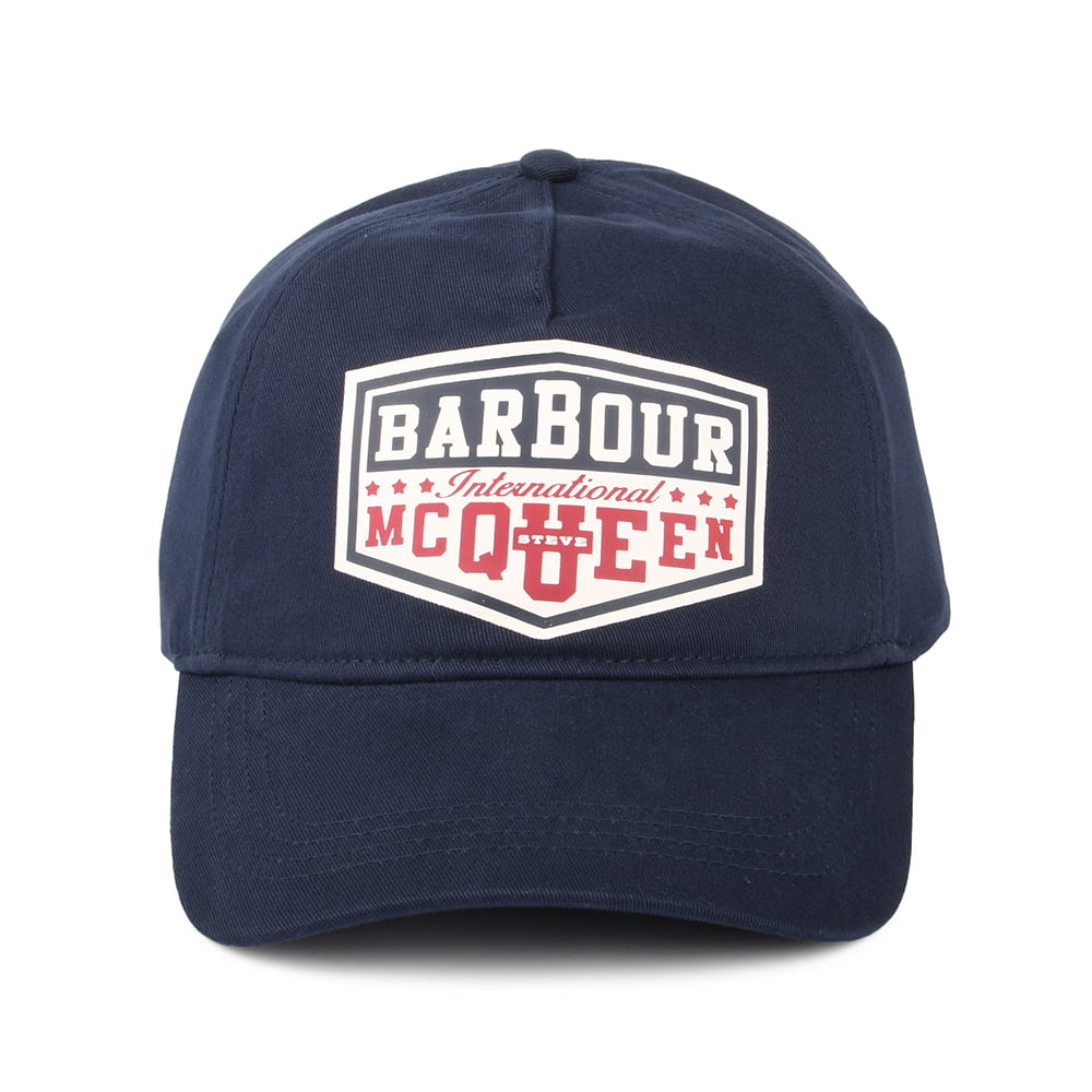 The Barbour International SMQ Graphic Baseball Cap in navy blue features a unique Barbour Steve McQueen logo graphic on the front of the unstructured crown. The hat is made of 100% cotton and features a pre-curved brim and an adjustable strap at the back of the hat for a comfortable fit.
