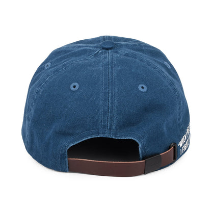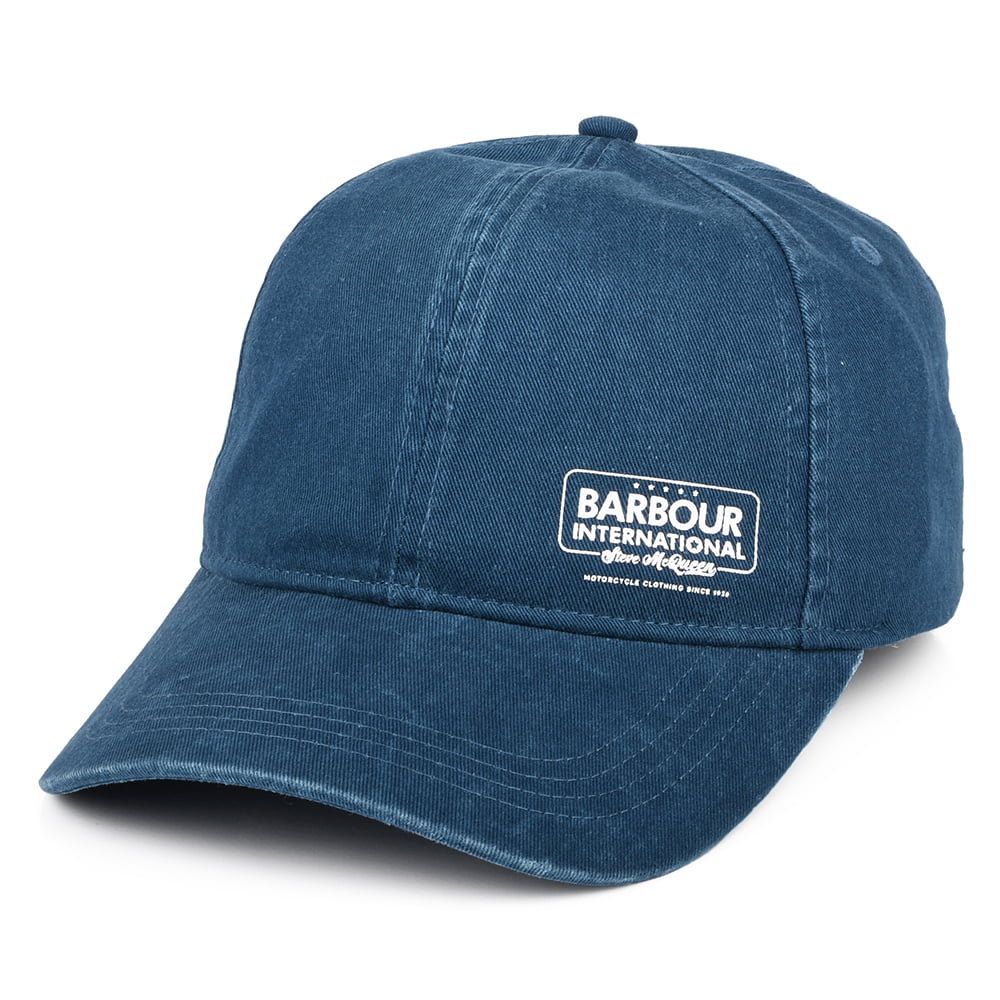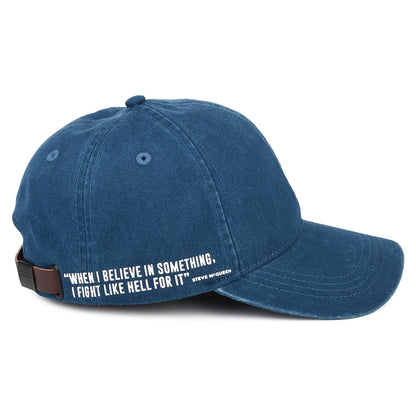 Barbour International SMQ Racer Baseball Cap in blue. This cap is a collaboration between Barbour and Steve McQueen Racing. The cap features their logos on the front left panel as well as a Steve McQueen quote "When I believe in something I fight like hell for it" on the side of the cap. There is a leather strap at the back that adjusts to ensure a great fit.