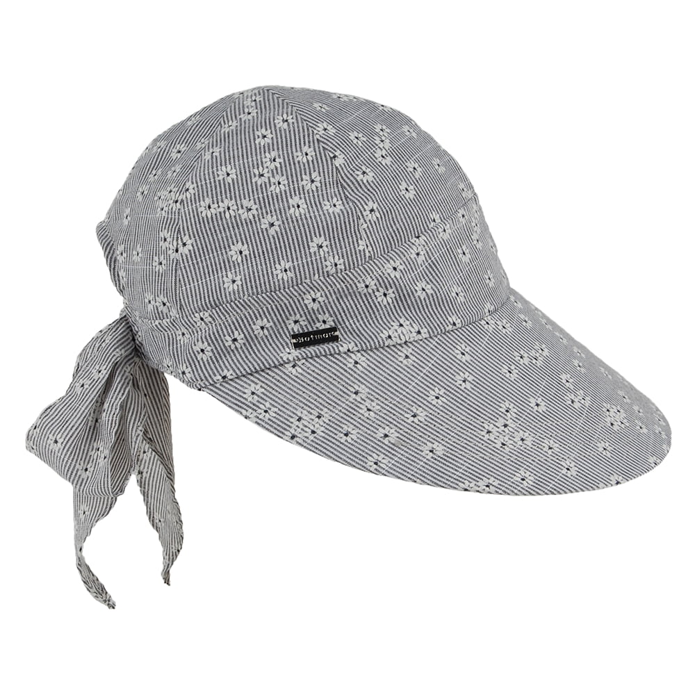 This is the Betmar Daisy Face Framer in navy multi. This beautiful sun hat has daisies printed all over. The brim measures approximately 11cm at the front. There is an elasticated strap at the back with a decorative bow for the perfect fit. There is a Betmar pin attached on the right side of the hat. This would be the perfect addition for any spring and summer wardrobe!