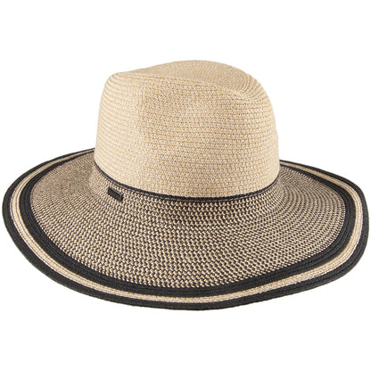 Here is the Betmar Hats Porto Fedora Hat in natural-black This is a nice casual women's fedora hat perfect for summer. The hat features a striped brim and a Betmar pin on the side. The brim is approximately 8.5cm wide. The crown is approximately 11cm high.