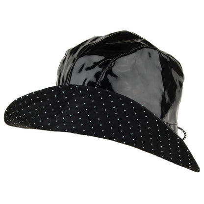 The Rachel Classic Vinyl Bucket Hat in black by Betmar is a great rain hat that is both fashionable and useful. The water repellant shell keeps the water out and the polarfleece lining prevents any warmth from escaping. On the back is a small Betmar logo attached and a string ending in a bow, which can be used to adjust the size. The brim is longer in the front and has polka dots on the underside. An elastic chin band secures the hat to your head even on stormy days.