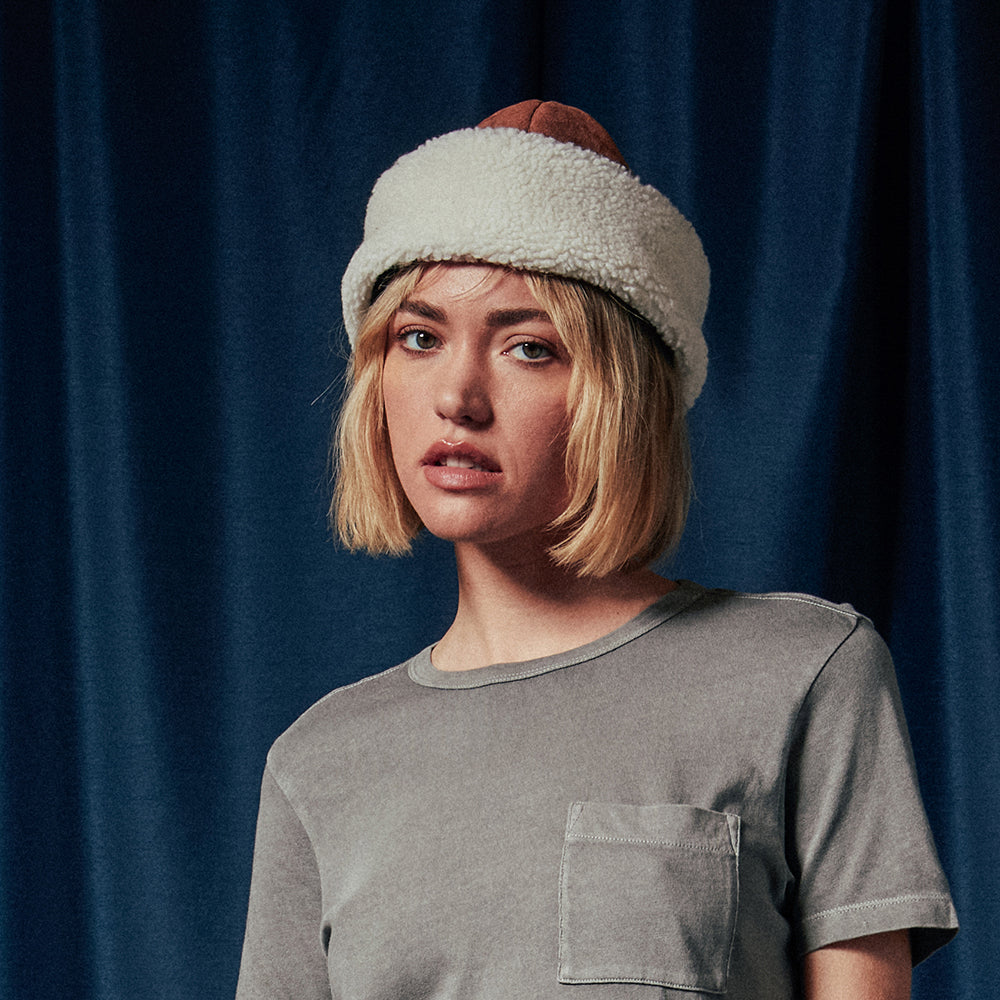 The Ginsberg winter hat in toffee-off white features a faux suede crown and a faux sherpa cuff. This cool hat comes with a quilted lining that will be sure to keep you warm on those cold winter days.