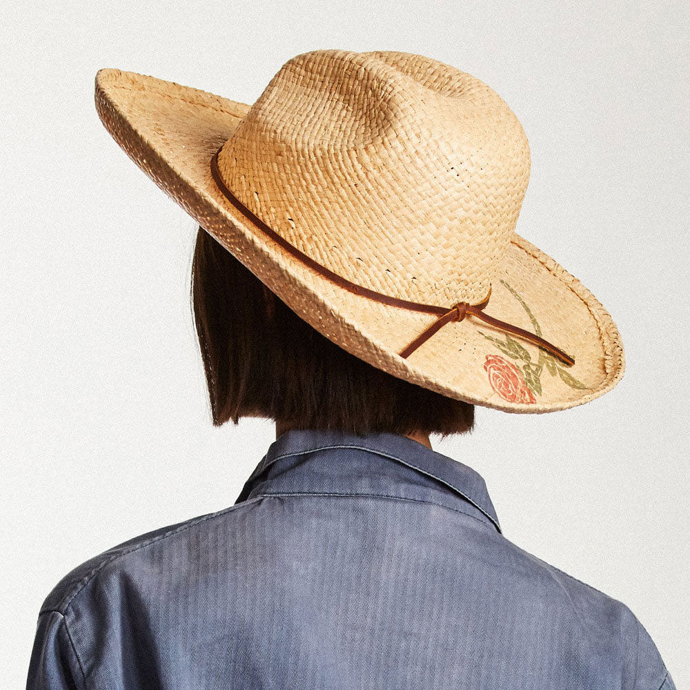 Here is the Brixton Jenna Fedora Sun Hat in natural. This wide brimmed straw hat features a leather hat band and a unique rose print on both the back of the brim and the front of the underbrim. The hat is made of 100% raffia straw and is unlined.