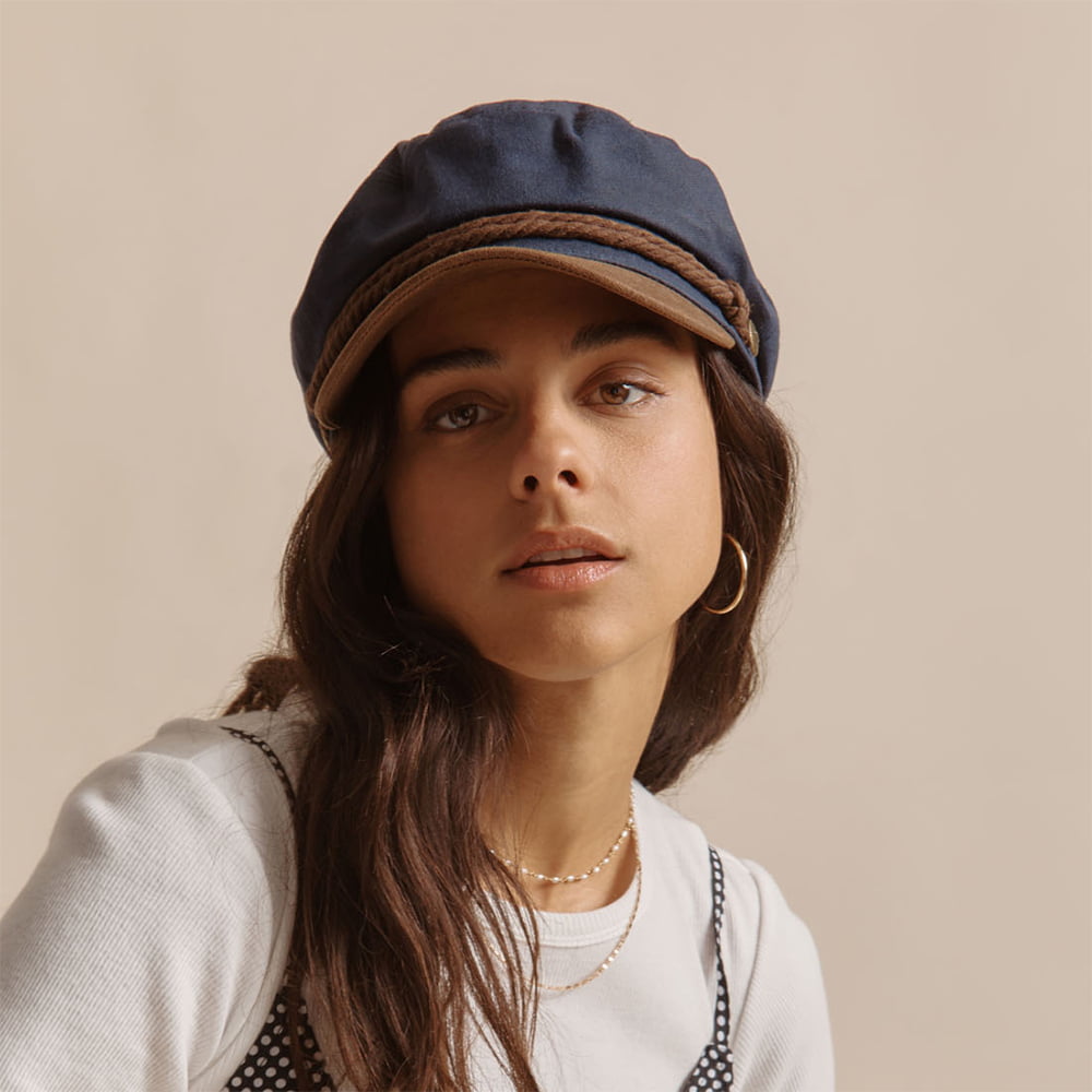 The Waxed Cotton Fiddler in navy-brown is the latest version of the classic style by Brixton. A rope decorates the front of the crown and it is affixed to both sides with metal Brixton buttons. The interior of the cap is lined with satin and also features a cotton sweatband. The Brixton signature is embroidered on the back towards the left side.