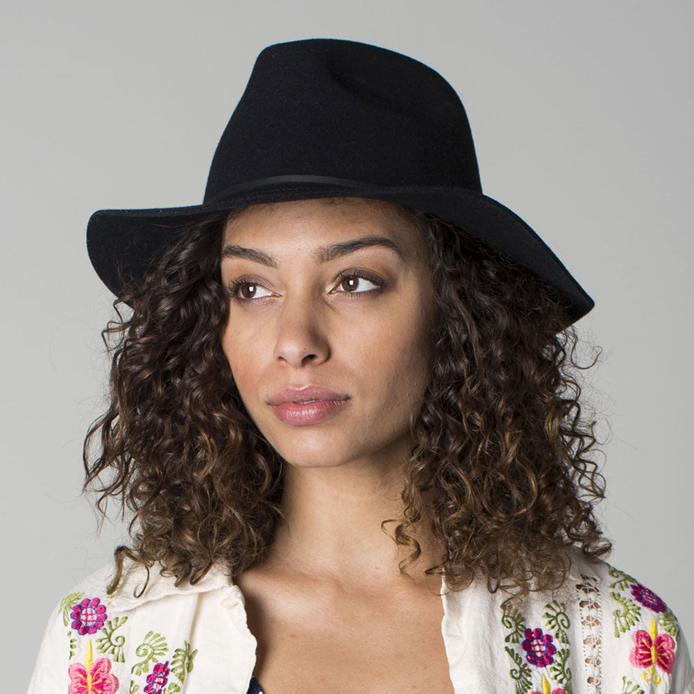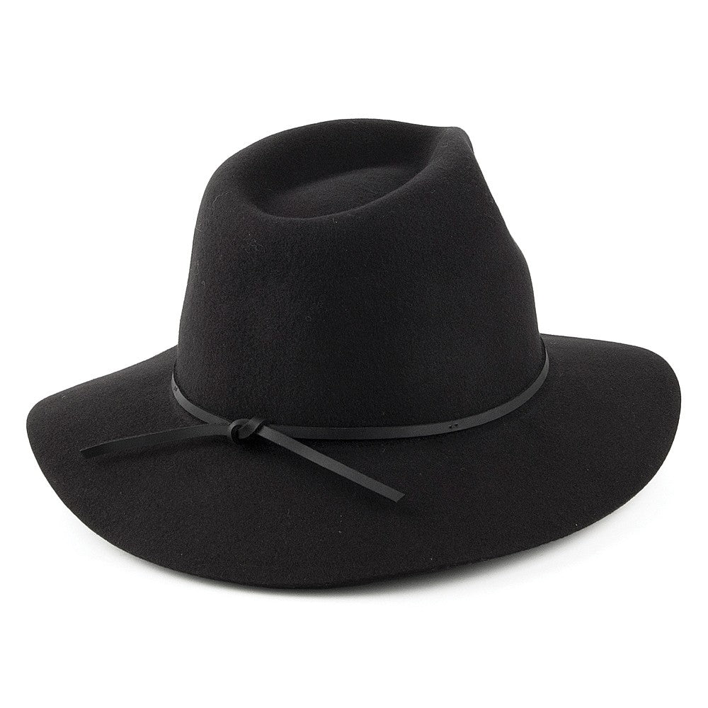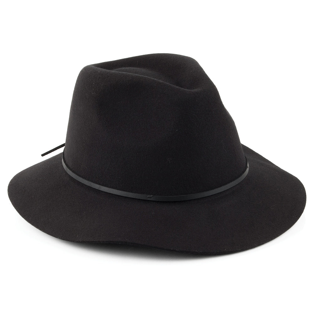 The Brixton Wesley Fedora Hat in black is a raw edged wide brim felt fedora with a leather band. This simple yet elegant fedora is currently one of the most popular styles in fashion. The hat is unlined and finished with a cotton sweatband for comfort.