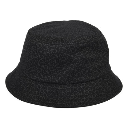 This is the Calvin Klein Mono Blend Cotton Bucket Hat in black. The hat features the Calvin Klein initials over the whole hat. The hat is made of cotton and comes unlined for a comfortable fit on a warm day.