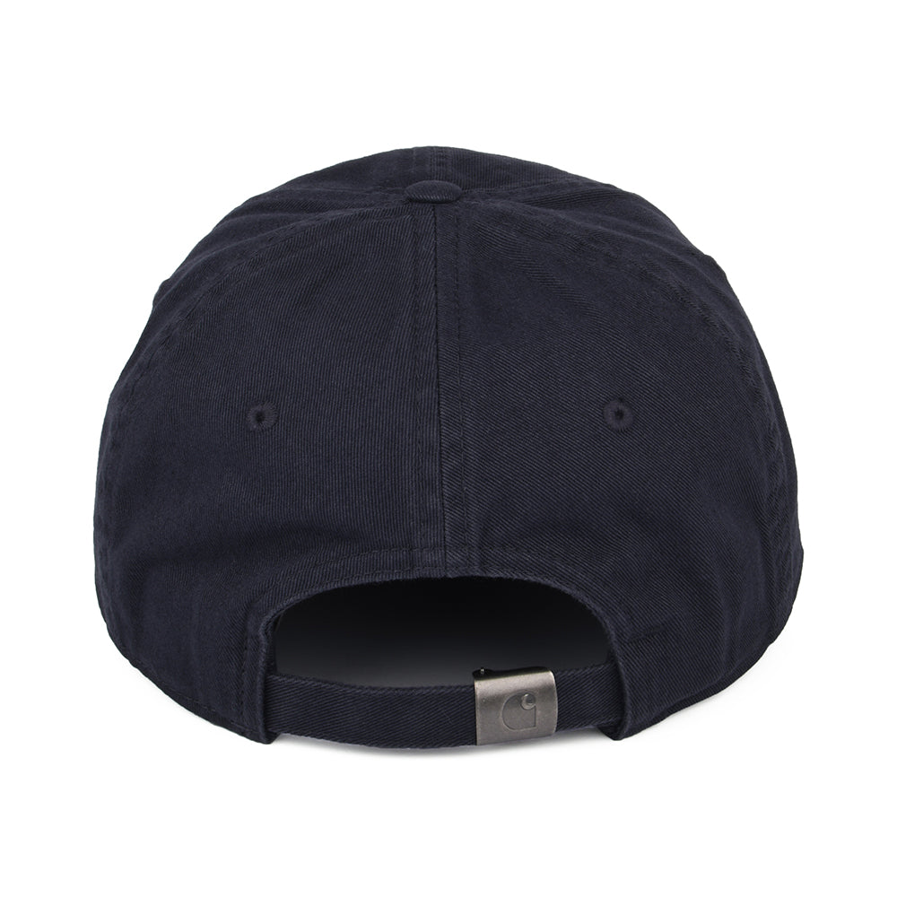 The Carhartt WIP Madison Logo Baseball Cap in dark navy is made of 100% cotton and features a small Carhartt WIP logo embroidered on the front of the unstructured crown. The hat comes with a pre-curved brim, eyelets for ventilation and an adjustable strap at the back for a comfortable fit.