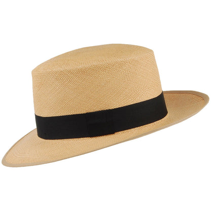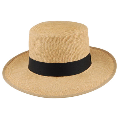 This is the Christys' Camila Wide Brim Panama Boater Hat. This hand woven hat is made of genuine Toquilla straw that has been left in a natural straw colour. The unblocked hat has been shipped to the UK and finished in Christys' factory in England with a grosgrain edge on the brim, a grosgrain hat band and a cotton sweatband on the inside.