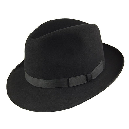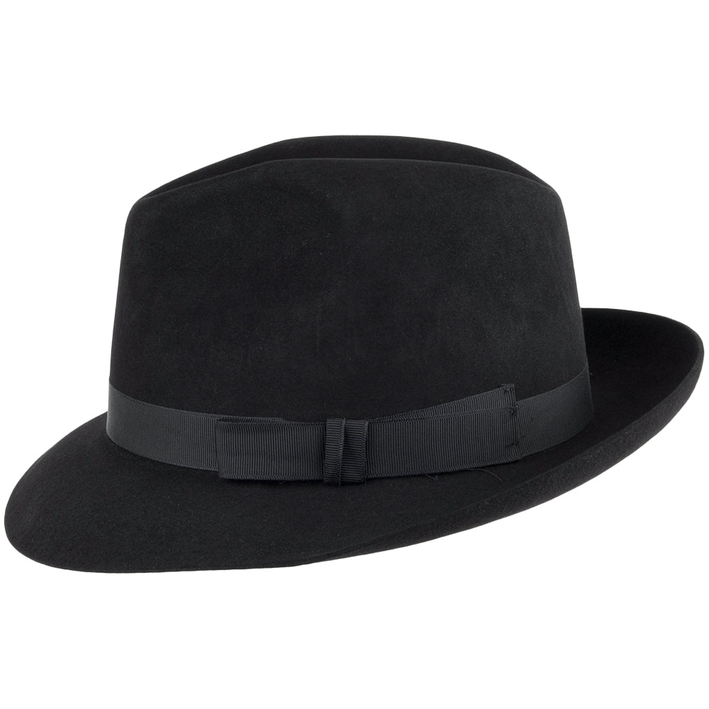 Classic, traditional design. No one does this better than Christys'. This Epsom in black practically defines the Christys’ look. This beautiful 100% fur felt fedora has a 4 inch high crown and 2 1/4 inch wide brim. The hat is offset ever so slightly with a 3/4 inch wide grosgrain ribbon. It’s finished in typical Christys’ style with a satin lining and genuine leather sweatband.