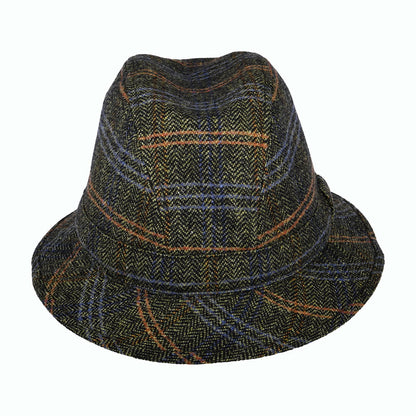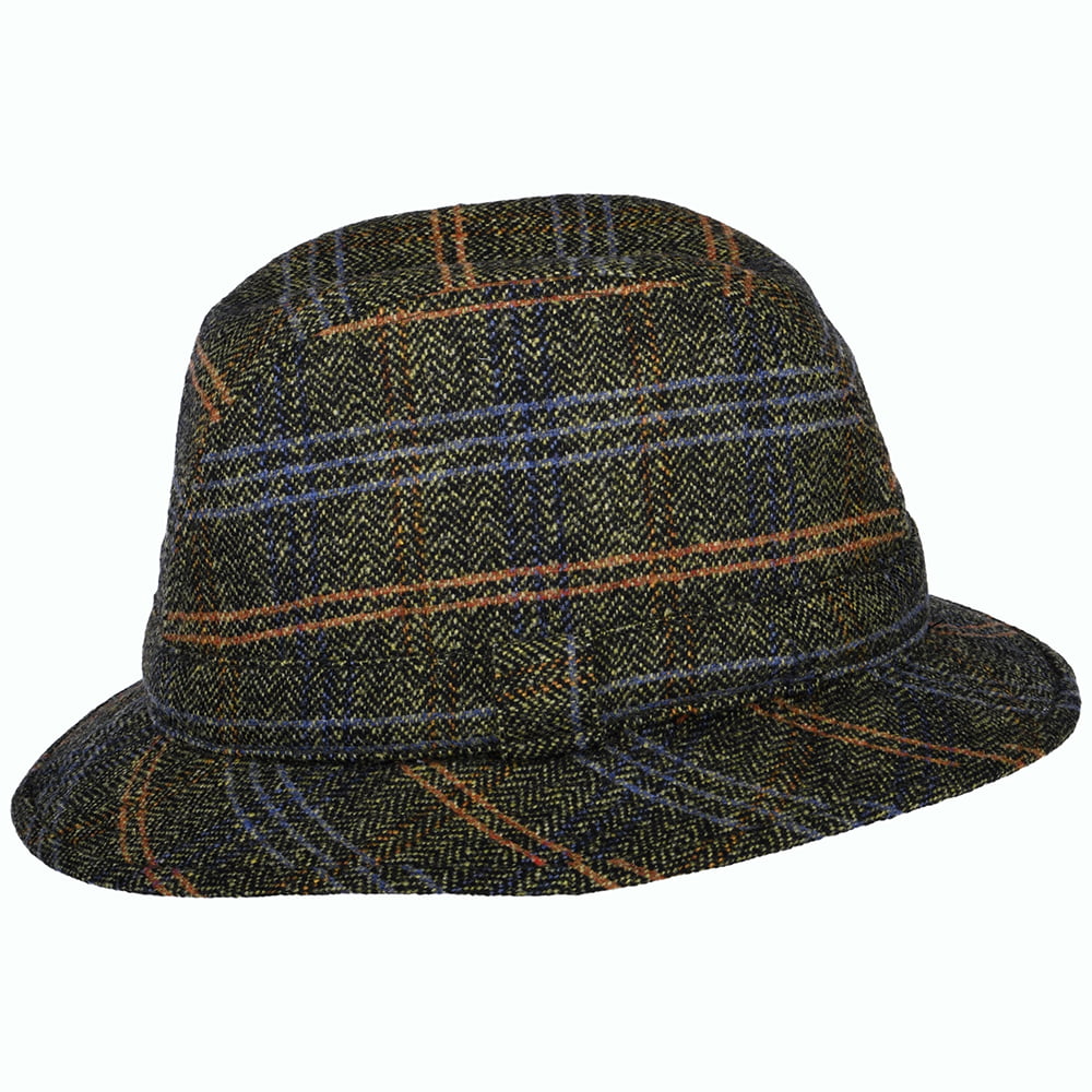 This is the City Sport Rollable Herringbone Trilby Hat in tan-black-multi. The 100% virgin wool trilby features a herringbone and windowpane pattern. There is a short, malleable brim and a soft crown which allows this hat to be rolled up and packed in a suitcase for travel.