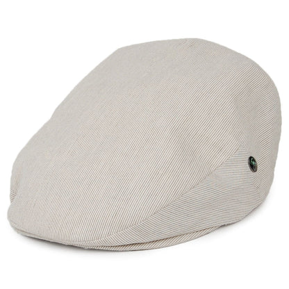 This is the Promo Linen Pinstripe Flat Cap from City Sport in cream-tan. This wonderful linen/cotton cap has a subtle pinstripe pattern. The cap has a sewn down brim and there is a removable City Sport pin on the side. There is a breathable mesh lining in the inside, which makes it the perfect summer cap.