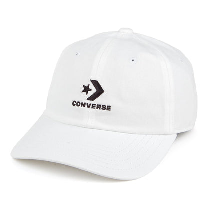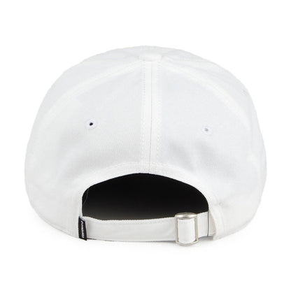 The Lock Up Baseball Cap from Converse in white is made of 100% cotton. This unstructured cap has the Converse logo embroidered on the front. There is an adjustable strap at the back for easy sizing and eyelets in the crown for ventilation.