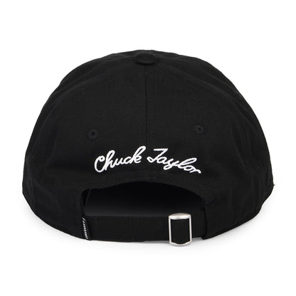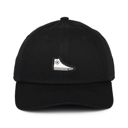 Here is the Converse Novelty Chuck Baseball Cap in black. This cap features the Converse Chuck Taylor shoe embroidered on the front of the hat. There is a pre-curved brim and an adjustable strap at the back of the cap.
