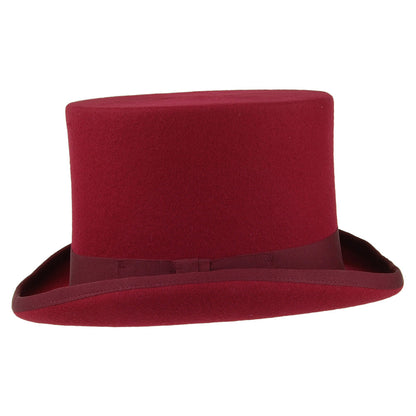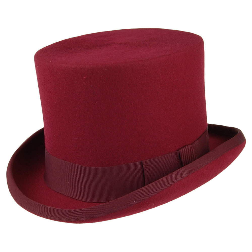This top hat from Denton is a classic style with a twist as it is in a maroon colour. The hat is made of wool felt, has a leather sweatband, satin lining and a grosgrain hat band. The curved brim is finished off with grosgrain as well.