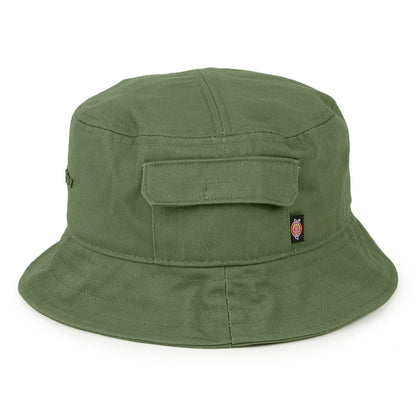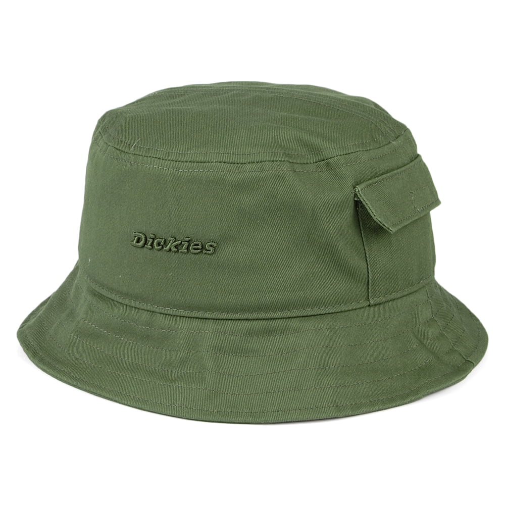 This is the Dickies Bogalusa Bucket Hat in dark olive. The hat features the Dickies name embroidered on the front. There is a pocket on the left side with a Dickies flip tag sewn to the seam.