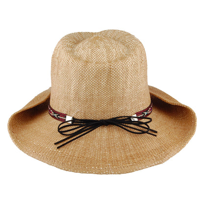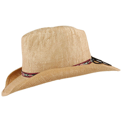 This is the Amarillo Toyo Western Cowboy Hat from Dorfman Pacific in tea. This great hat has the sides of the brim curled up. It is decorated with a beautiful woven hatband, which ends in a bow at the back. The inside is unlined and there is an elastic sweatband for comfortable fit.