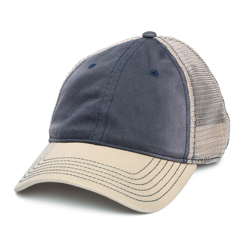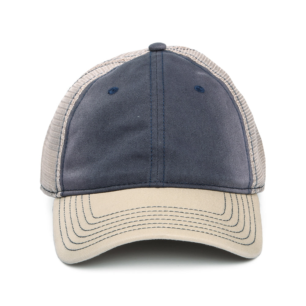 Here is the Dorfman-Pacific Cotton Trucker Cap in navy blue. The unstructured cotton front has a distressed look and the mesh at the back is very soft. The cap is finished with an adjustable snap at the back and a pre-curved brim.