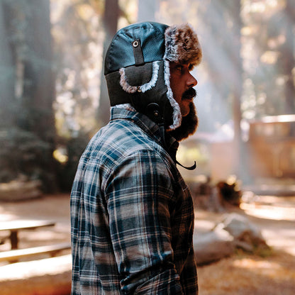 The Dorfman Pacific Faux Leather Trapper Hat in brown is a super warm trapper that features a faux leather crown and cotton earflaps lined in soft faux fur for the cold winter months. The inside of the crown is lined in quilted satin. There is a chin strap that will keep it secure on your head.