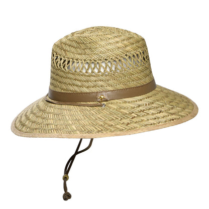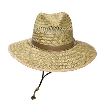 The Dorfman Pacific brings you the Rush Straw Lifeguard Hat in natural. The perfect hat for hot conditions. This 10cm wide brim will protect you from the sun whilst the loose weave around the 12cm high crown will keep you cool. The chin cord is shown around the crown to then go through two holes on either side of the hat. The hat is finished with a Kangaroo pin on the side of the hat band.