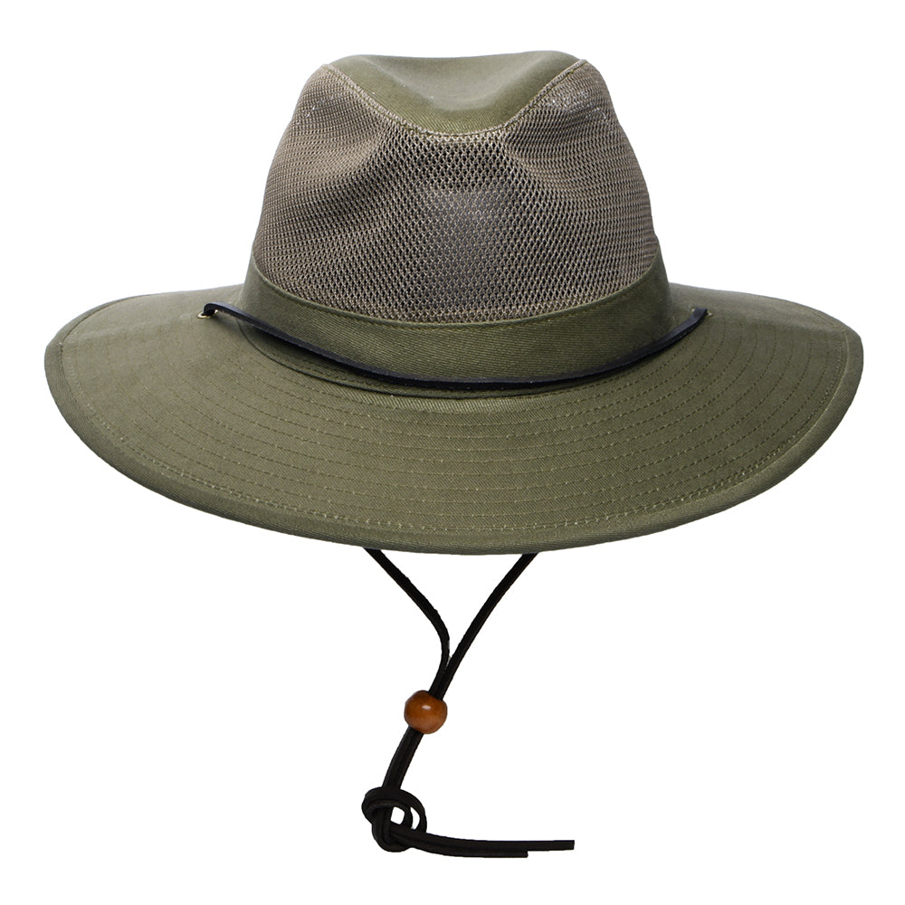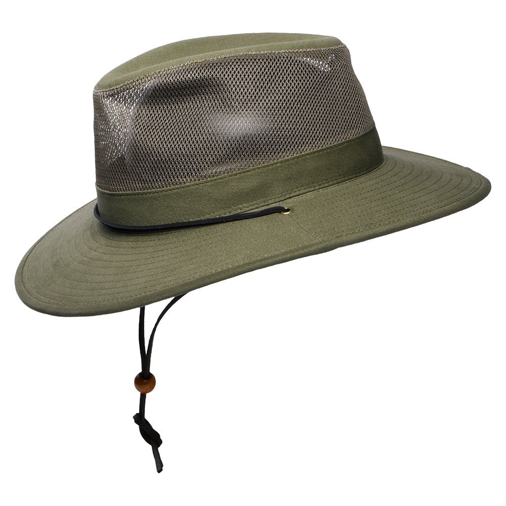 The Dorfman Pacific Traveller Vented Aussie Hat in loden is an Australian style hat with a mesh crown and solid brim. The nylon mesh sides magnify the cool breeze around your head while the solid top and brim protect your head and face from the sun's harmful rays. The hat features an adjustable leather chin cord. This excellent summer item has a 8.5cm wide brim and 9.5cm high crown.