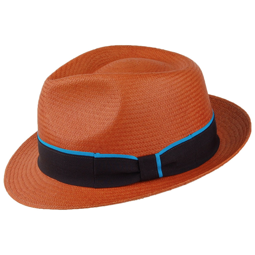 The Failsworth Panama Trilby Hat in amber is a fine example of the quality and workmanship that this fantastic brand can deliver. The hat is hand woven in Ecuador and features a black grosgrain hat band with a bronze coloured accent. The stiff brim measures approximately 5cm wide and the crown approximately 11cm.