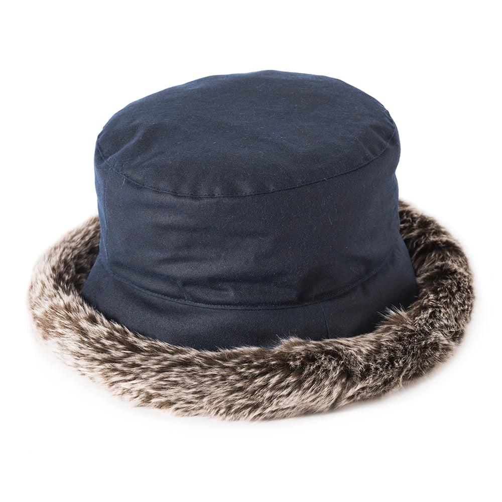 Failsworth Hats Classic Wax Cotton Faux Fur Trim Bucket Hat - Navy Blue