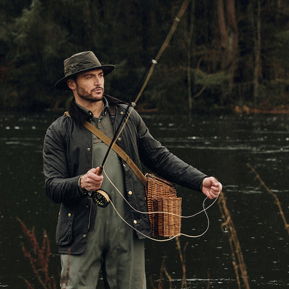 The Waxed Traveller Hat in olive from Failsworth is your perfect outdoors hat. Made out of 100% British waxed cotton it will keep your head dry during light showers. For a maximum comfort the hat has a sweatband and eyelets on the side.