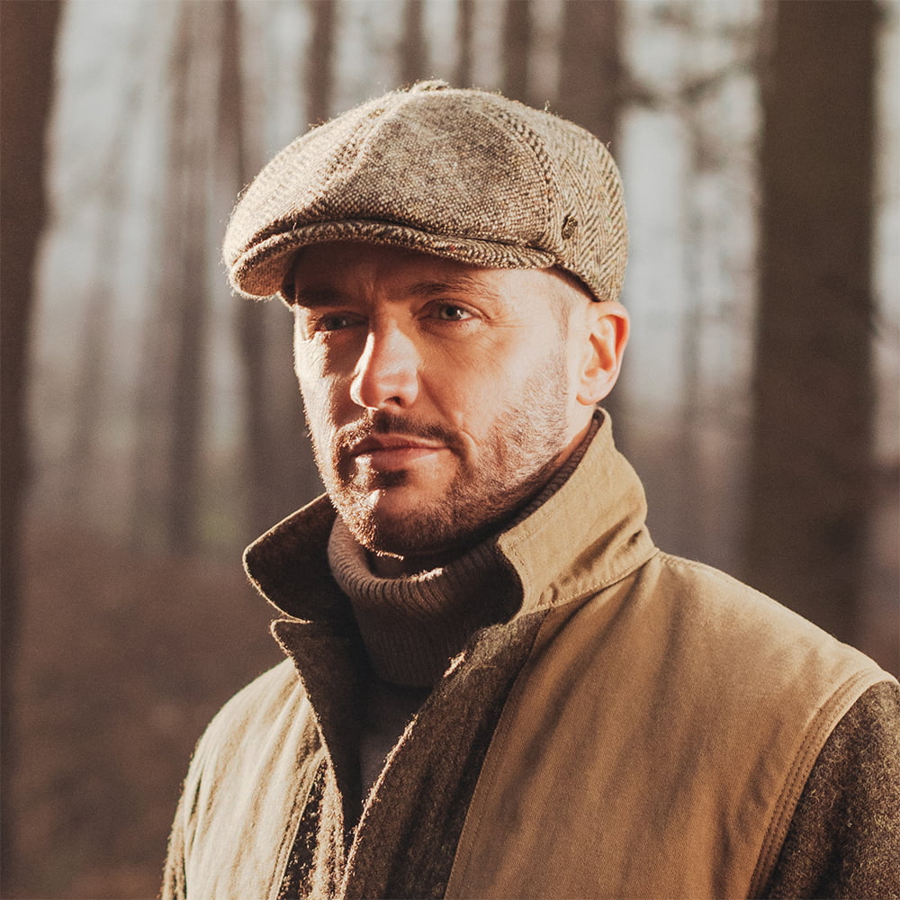 This is the Wexford Donegal Tweed Newsboy Cap in brown from Failsworth. This beautiful newsboy cap has a differently patterned panels, which gives this cap its distinctive look. It has a sewn down brim and a removable side pin. In the inside is a quilted lining and a grosgrain sweatband for extra comfort.