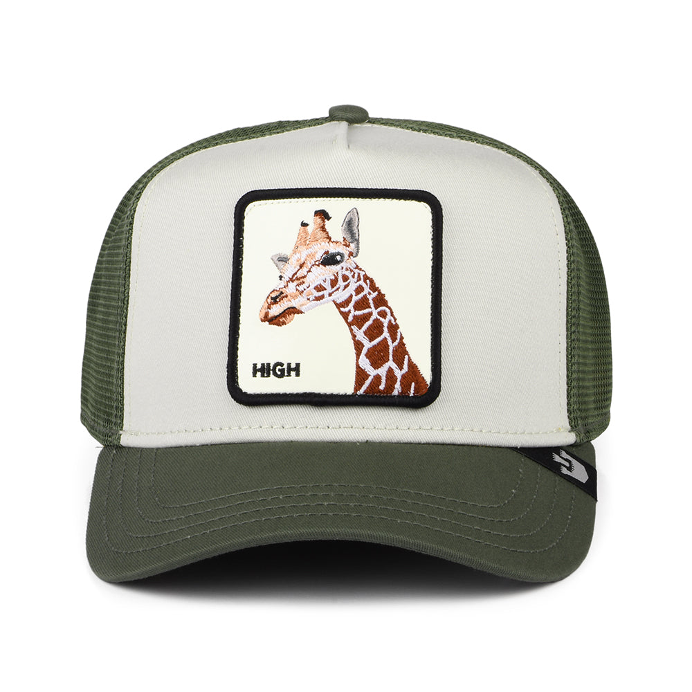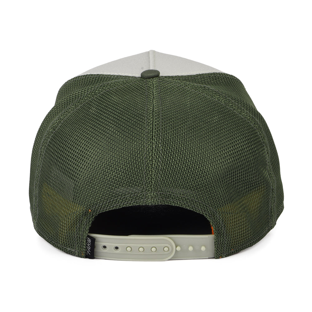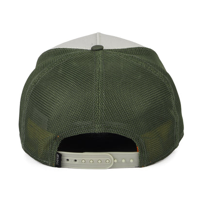 The Goorin Bros. V2 High Trucker Cap in olive-white features a mesh back and an adjustable snap at the back for easy sizing. An embroidered Goorin label is sewn to the side of the brim. A unique patch is sewn on the structured front panel.