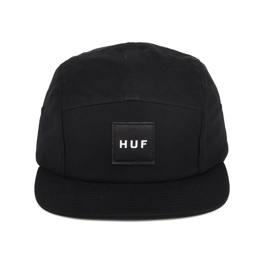 The HUF Essentials Box Logo 5 Panel Cap in black is made of a cotton blend. A HUF patch is sewn to the front of the crown. There is also a HUF flip tag sewn next to the adjustable strap at the back. There are eyelets on the sides to encourage ventilation.